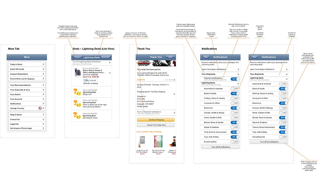 I worked on mobile notifications for Amazon’s deals and shipping information in late mid 2012 on the iPhone, with a fast follow for the Android platform. I dove deep with the product manager on the business logic, and the development teams on the native and server components, to learn the capabilities and constraints of the notification system that included the back end, OS and the shopping apps. Given the complexity and all the moving parts of the system, the requirements gathering phase easily took as much time overall than the rest of the design.